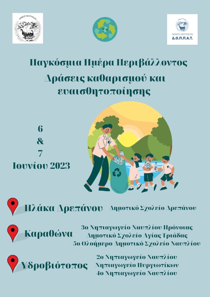 Το κύριο θέμα της φετινής Παγκόσμιας Ημέρας Περιβάλλοντος είναι η μείωση της πλαστικής ρύπανσης. Πάνω σε αυτό ο Δήμος Ναυπλιέων και ο ΔΟΠΠΑΤ σε συνεργασία με τους μαθητές και τους εκπαιδευτικούς,  θα πραγματοποιήσουν δράσεις προκειμένου να υπενθυμίσουν σε όλους την πολλαπλή σημασία των περιβαλλοντικών παραμέτρων καθώς και την προσπάθεια που πρέπει να καταβάλλεται από όλους μας για τη διατήρηση των οικολογικών ισορροπιών με στόχο την ενημέρωση και ευαισθητοποίηση όλων για τα περιβαλλοντικά θέματα καθώς και την διοργάνωση σχετικών εκδηλώσεων και ομιλιών.